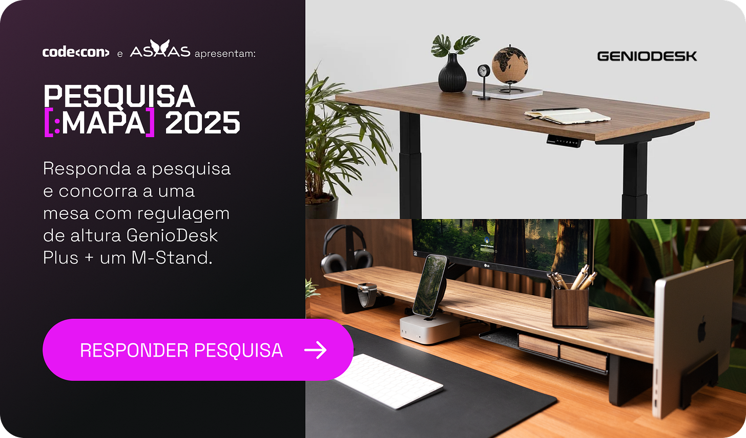 Está no ar a Pesquisa [:mapa] 2025 um levantamento que mapeia o mercado de tecnologia no Brasil. Ela leva cerca de 10 minutos e, ao participar, você contribui para valorizar profissionais da área e a guiar marcas em estratégias mais conscientes no mercado de tecnologia. Seu ponto de vista como pessoa desenvolvedora importa muito. Ah, e você pode concorrer a uma mesa de altura regulável da GenioDesk + um M-Stand. Bora participar?